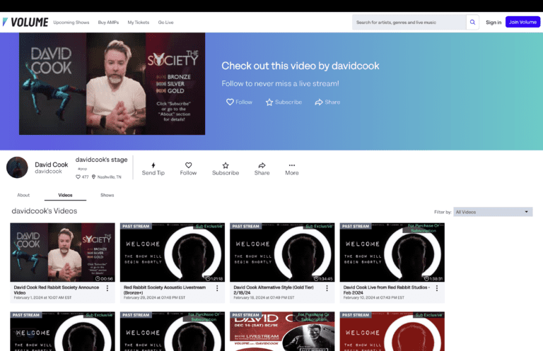 Volume.com is an amazing place to build experiences around your album or EP launch through livestreams and fan club experiences. It’s an easy way to create recurring revenue for yourself, while giving your fans the VIP experience month after month.