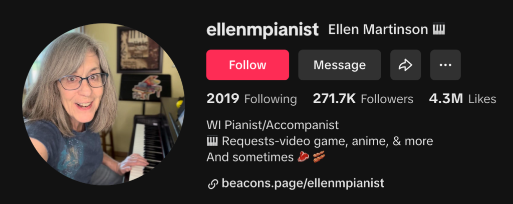 Ellen M is a pianist and TikTok content creator known for her engaging piano performances and tutorials. On TikTok, she shares a variety of content, including piano covers of popular songs, video game music, anime themes, and educational tutorials. Her engaging style and diverse repertoire have garnered her a substantial following on the platform. (@ellenmpianist)