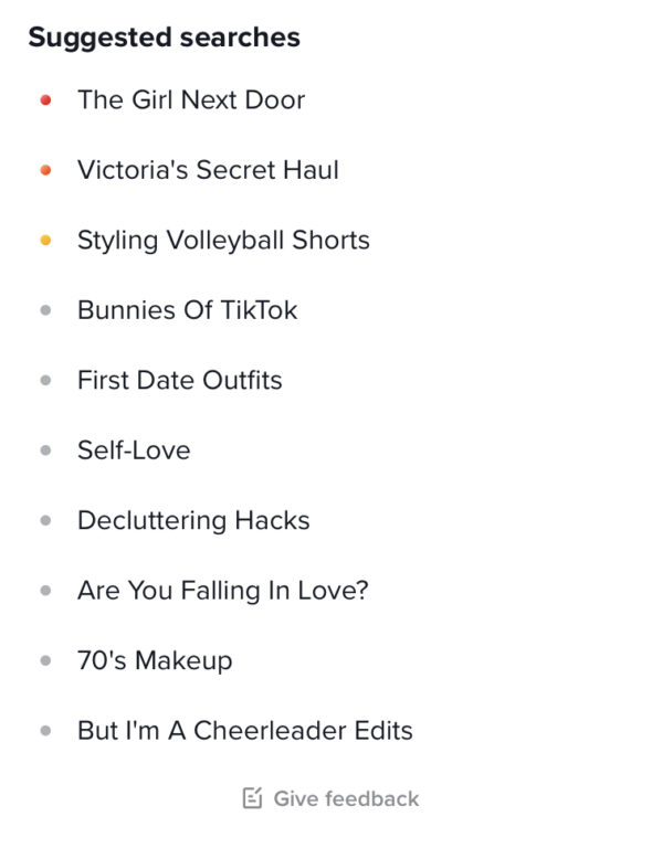 Additionally, the trending hashtags on TikTok change daily, so do your research on what tag is most popular to add to your caption before posting! As you can see below, trending tags such as #TheGirlNextDoor and #BunniesofTikTok appear in the “suggested searches” feature when you click your search bar.